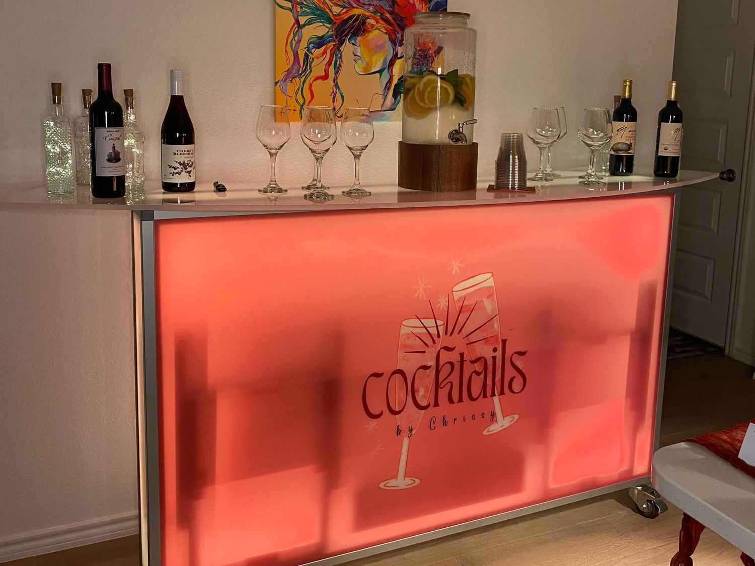 TABC certified bartenders. Gorgeous custom-made portable bar that we can bring, or we can use your bar set up, if applicable. We provide glassware, straws, cocktail napkins, ice, garnishes, mixers & custom specialty cocktail menu, as well as handle set up and clean up of bar area. The only thing you provide is the alcohol.